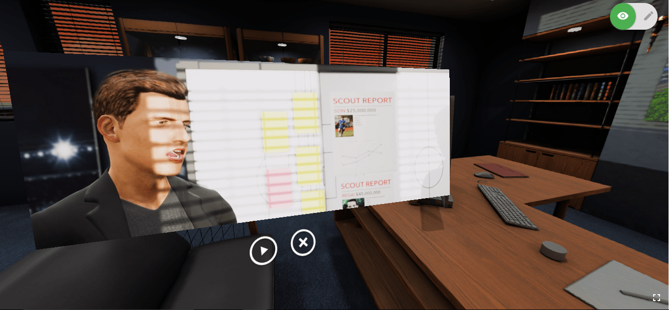 In this 360 VR serious game-based program the participants adopt a soccer club manager’s role and act out multiple tasks that the manager would perform in real life team management situations. Starting from the appointment as manager these tasks include managing meetings, analyzing team strengths and weaknesses, crucial conversations, appointing team roles, SWOT Analysis, feedback skills, conflict resolution, strategic planning, analyzing performances, motivating others and resolving conflicts.