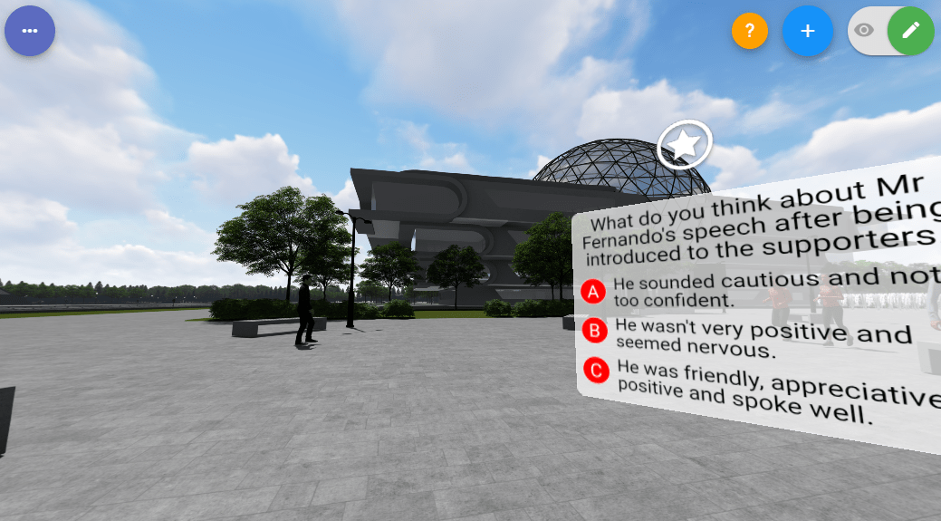We have developed this virtual human public speaking simulator to assist in creating virtual audiences in varying situations. This simulator can give an initial boost of confidence to those who wish to practice speaking in front of different audiences. They can practice in the safety of a virtual environment. Simulator 2.0 is in the works and will have enhanced capabilities to provide crucial feedback such as eye contact, gestures, facial expressions and body language in the next stage. This will boost the confidence of the employees to elevate their speaking skills to another level with constructive feedback.
